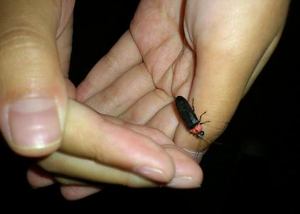 (飛んでいる蛍を写真に撮るのは難しかったので、手に止まった蛍でごめんなさい。)