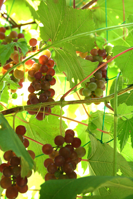 さて、10日前にiyoさんがブログに書いていたように、あれからブドウもいよいよ実が色づいてきました。そろそろ収穫の時期ですね。でも、すでにどこからか鳥がやってきて、実をついばんでいっているようで、ところどころ枝しか残っていないものもあり…。