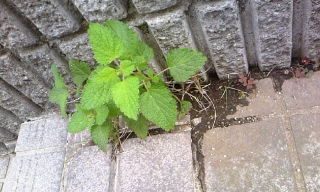 先日、塀と玄関アプローチの境目から葉っぱが生えているのを発見しました![]()