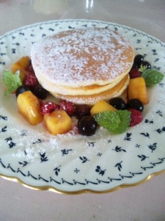 庭からミントの葉をチョイス ベリーいっぱいのパンケーキ出来上がり![]()