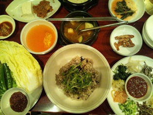 10種類のナムル (ホウレン草・ダイコン・ワラビ・豆もやし・白菜・キノコ・シラヤマギク・さつまいものつる・かぼちゃ・キキョウ