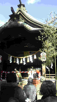 3回に分けて神前でのご祈祷と奉納の舞「舞浜の舞」が行われ、年男や地元の企業の代表や東海村のユルキャラ「イモゾー」と「イモジー」が福豆、福銭、お菓子等を集まった人々に壇上からまいていました。ミカンなども飛んできてなかなか活気にあふれていました。